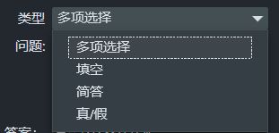 1)点击类型,选择测验类型。Camtasia提供了多项选择、填空、简答、真/假四种测验类型,其中真/假就是我们常说的判断题。