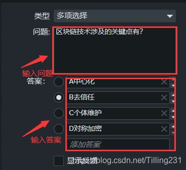 2)点击问题框输入问题,并在下方答案栏设置选项,在正确答案前方打上“白点”;