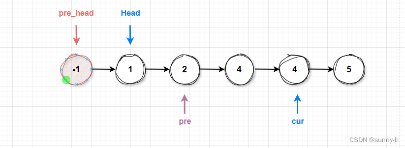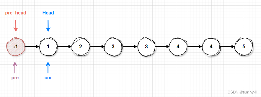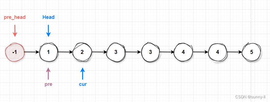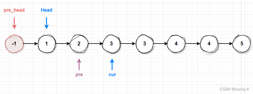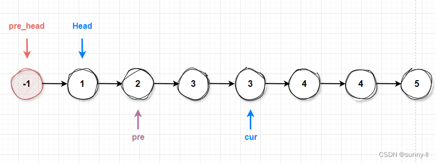 - 我们先创建一个 哨兵位的头节点 pre_head , 令 pre_head->next = head , 然后创建 双指针 pre 指向 pre_head ,指针 cur 指向 head , 开始遍历整个链表