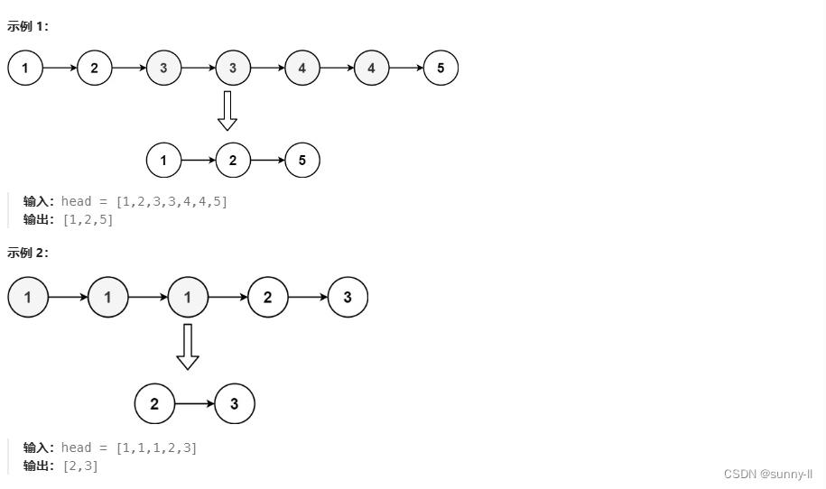head, 删除原始链表中所有重复数字的节点,只留下不同的数字 。返回 已排序的链表