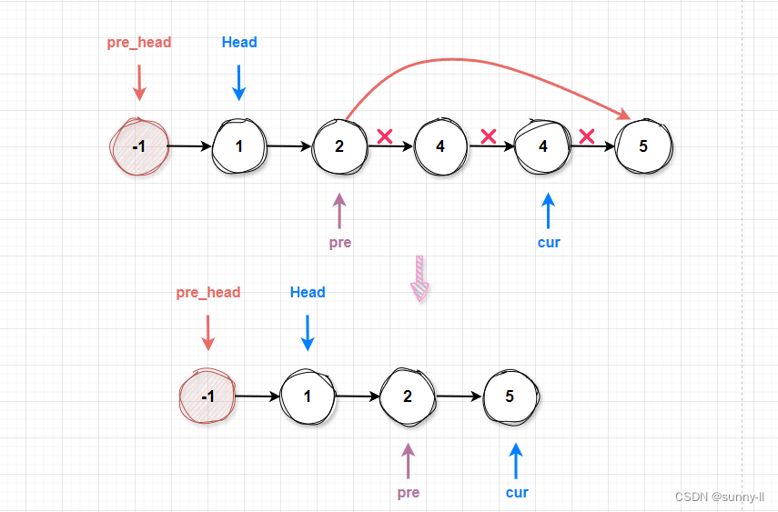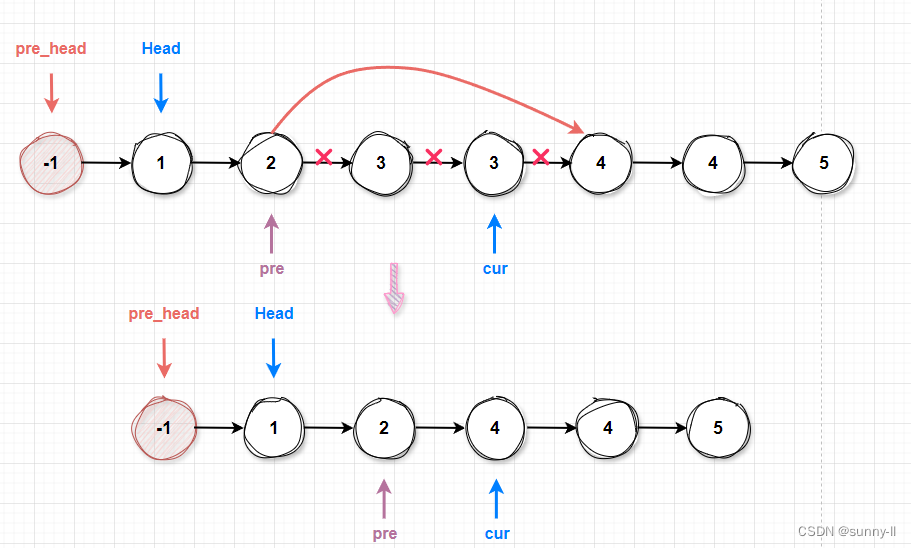 - pre ->next != cur 存在重复元素,跳过重复元素,重新建立连接