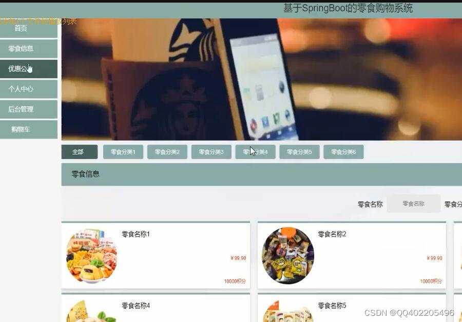 零食销售商城,在零食销售商城可以查看首页、商品信息、商品资讯、个人中心、后台管理、购物车、在线客服等内容,