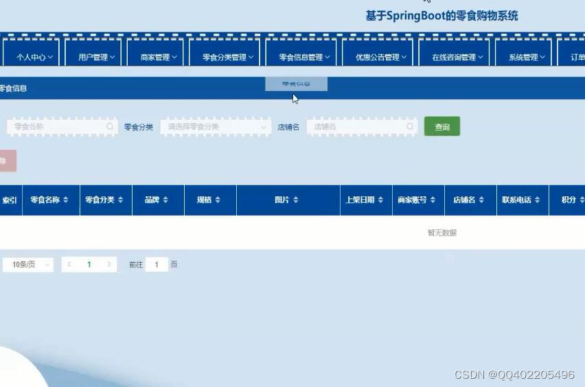 最后对系统进行功能测试,并对测试结果进行分析总结,得出系统中存在的不足及需要改进的地方,为以后的系统维护提供了方便,同时也为今后开发类似系统提供了借鉴和帮助。管理员登录进入零食销售商城可以查看首页、个人中心、用户管理、商品分类管理、商品信息管理、订单评价管理、系统管理、订单管理等信息。商品信息,在商品信息页面可以查看商品名称、商品分类、图片、品牌、规格、价格等信息进行添加到购物车、立即购买,零食销