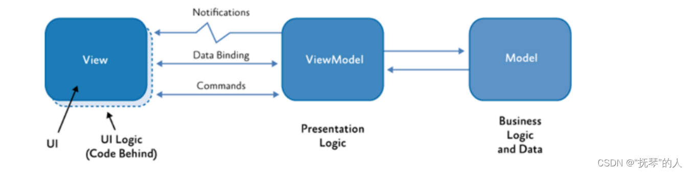 1、View负责前端展示,与ViewModel进行数据和命令的交互。