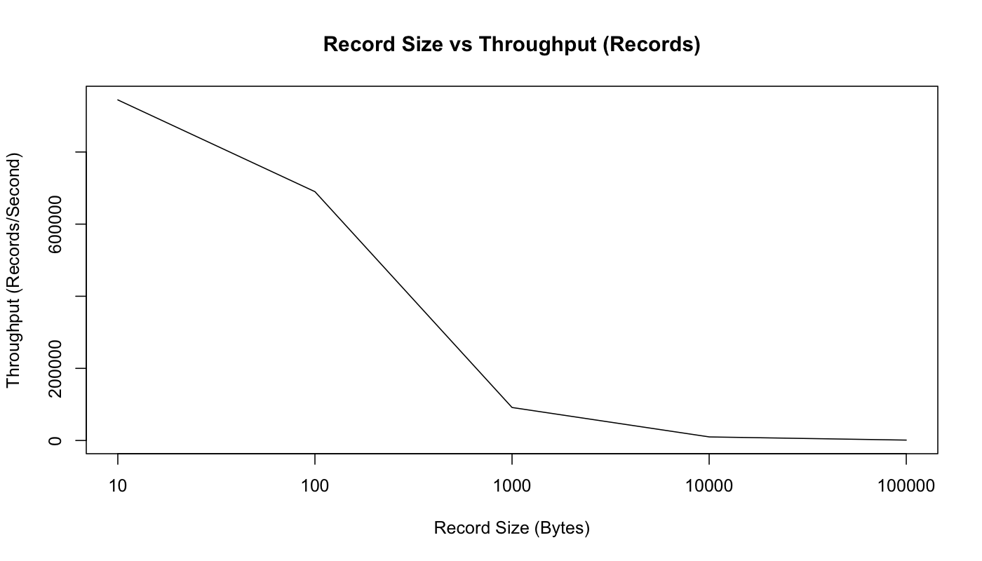 So, as we would expect, this graph shows that the raw count of records we can send per second decreases as the records get bigger. But if we look at MB/second, we see that the total byte throughput of real user data increases as messages get bigger: