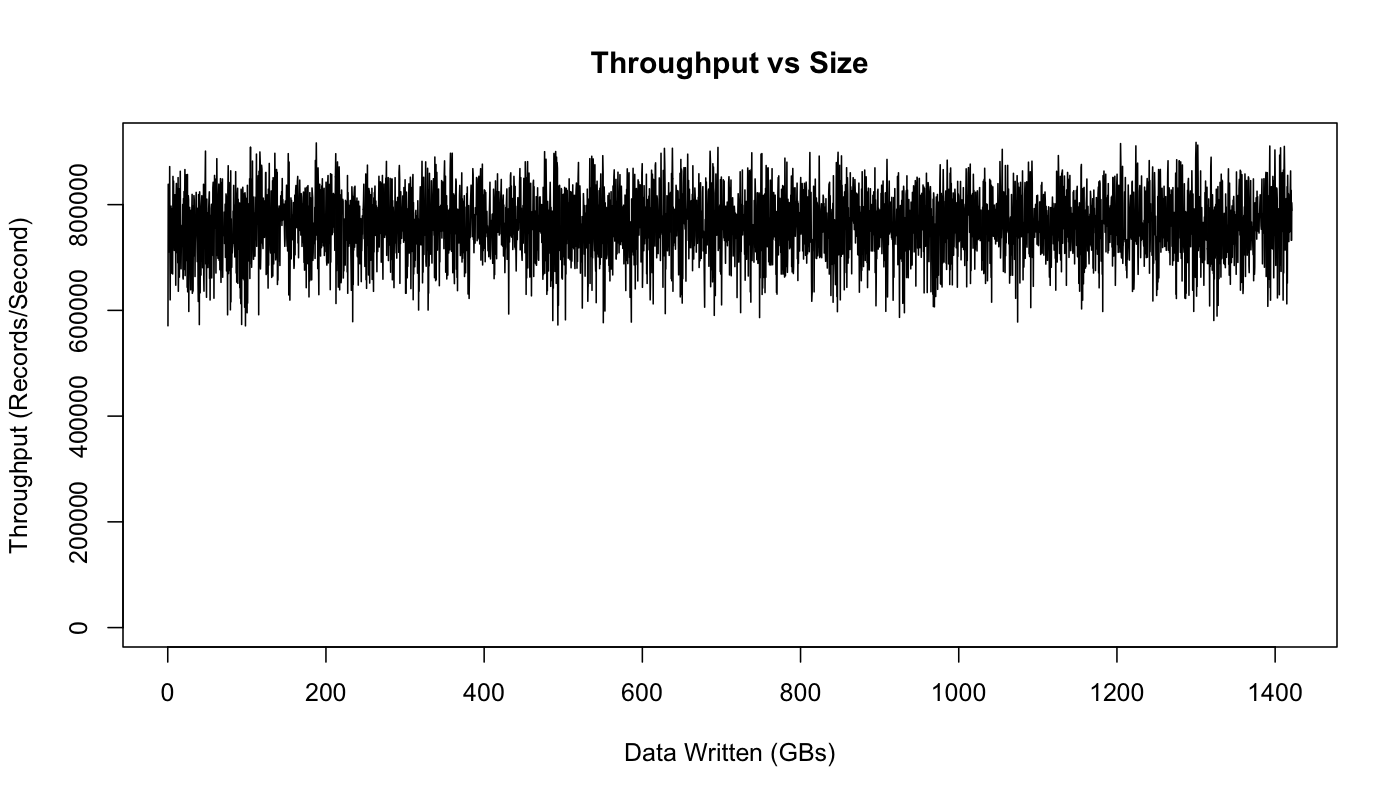 This graph actually does show some variance in performance, but no impact due to data size: we perform just as well after writing a TB of data, as we do for the first few hundred MBs.