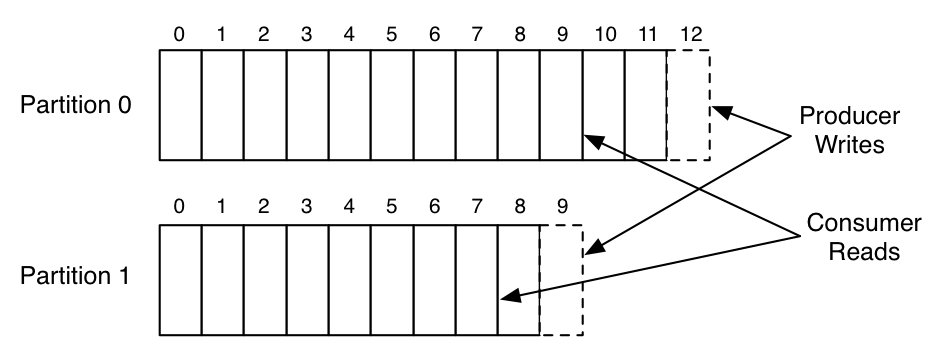 This picture shows a producer process appending to the logs for the two partitions, and a consumer reading from the same logs. Each record in the log has an associated entry number that we call the offset. This offset is used by the consumer to describe it's position in each of the logs.