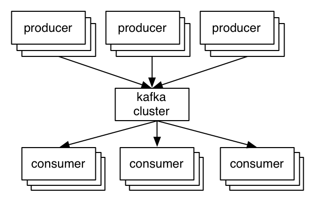 The general setup is quite simple. Producers send records to the cluster which holds on to these records and hands them out to consumers: