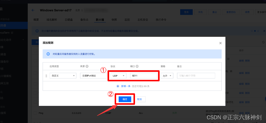 协议选择【UDP】,端口输入【8211】,最后点击【确定】:
