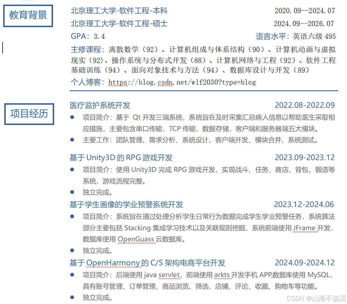 讲道理其实我感觉我表现挺差的,不过可能因为一直在和hr交流我的思考有加分,然后因为我的回答里面有一直在呼应我的项目,所以hr知道我确实有java后端开发的经验。(不过运气真的拉满了,我到现在都不理解我为什么要画那棵树,我一北理自动化加本校保研的哥们说他实习的时候7家面试只有两家offer,希望一年后正式找工作也运气这么好吧)最后因为之前发了鸿蒙开发的项目,可能看到这篇博客的人也有学习鸿蒙的,听我一句劝,孩子们,快跑,我实习计划投三个岗,java后端,unity开发和鸿蒙,结果你猜怎么着,鸿蒙在实习僧压根没有岗位,在boss倒是有四五个但压根没有理我,简历都发不出去。