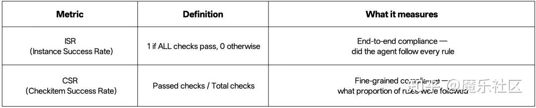 其中,CSR用来衡量Coding Agent遵循了多大比例的规则,ISR则用来衡量Coding Agent是否遵循了每条规则。