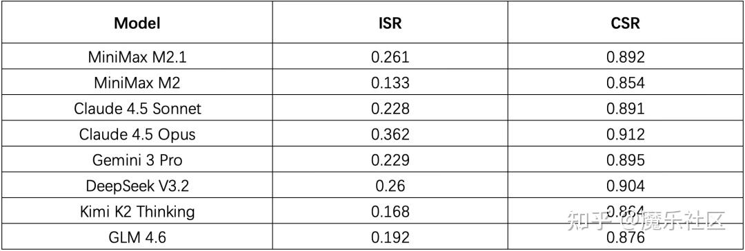 观察榜单可以发现,MiniMax M2.1 和DeepSeek V3.2的 ISR 分别达到了26.1%和26%,已经超过了公认强大的闭源模型Claude 4.5 Sonnet (22.8%) 和 Gemini 3 Pro (22.9%),开源模型已经展现出了极强的竞争力。
