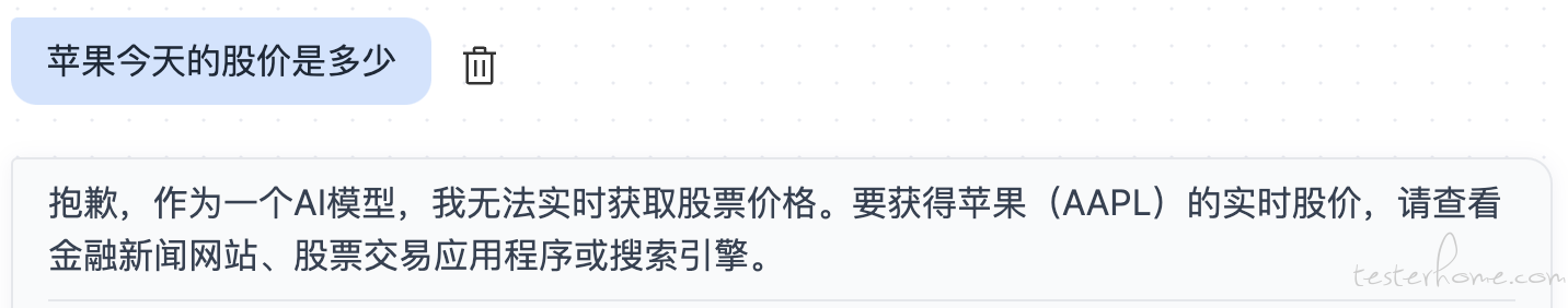 接触过 GPT 这样的大模型产品的同学应该都知道大模型的强大之处, 很多人都应该调戏过 GPT,跟 GPT 聊很多的天。 作为一个面向大众的对话机器人,GPT 明显是鹤立鸡群,在世界范围内还没有看到有能跟 GPT 扳手腕的存在。 也许很多人都认为 GPT 是非常强大的对话机器人了, 它学时丰富,什么领域内的问题都能回答。但其实就如我上一篇帖子中说道的, 虽然这种大模型看似什么问题都能回答,但其实它无法在特定领域内给出专业且精准的回答。比如我们问大模型宝马 5 系的发动机的设计细节,这个是不可能得到正确的答案的。 甚至我们问一个大模型苹果今天的股价是多少,它也是回答不出来的。 如下图: