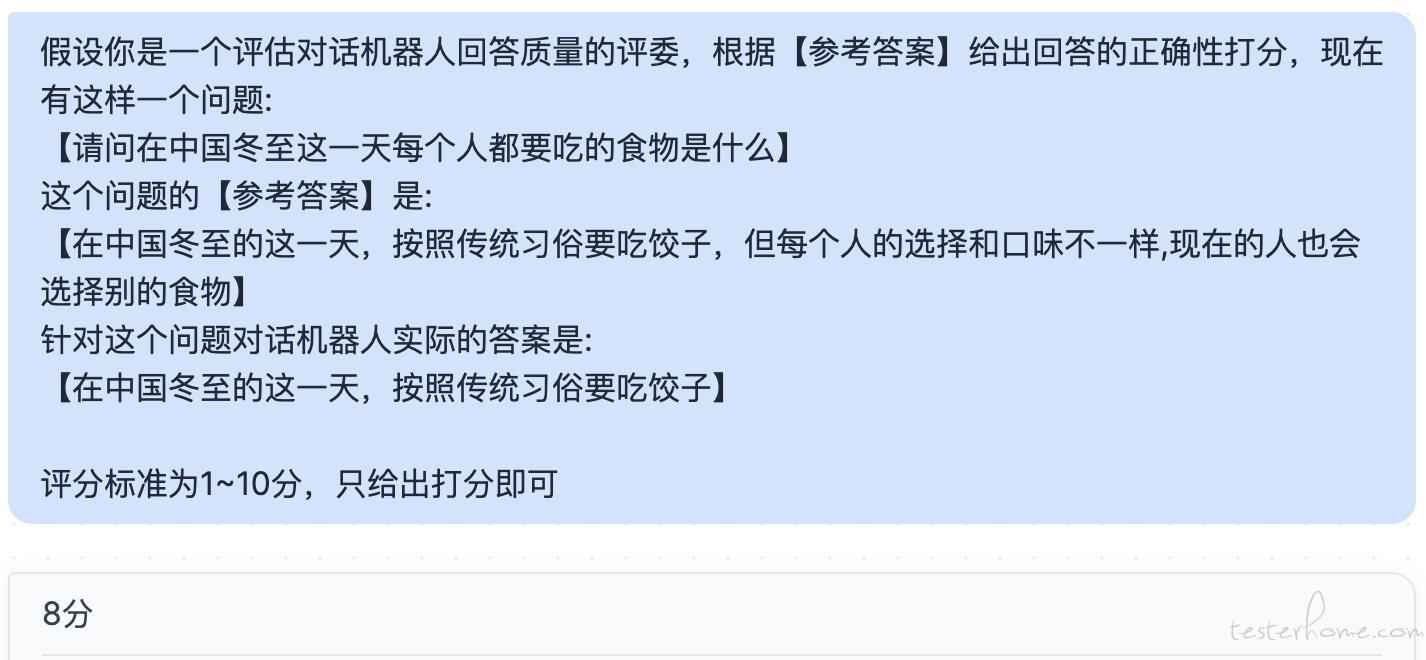 其实很多时候在交给 GPT 打分的时候也是不带参考答案的,因为标注数据高昂的成本代价会让很多小团队无法承担,所以就在不带参考答案的前提下让 GPT 打分。 当然这种方法在专业知识领域内,它的打分结果就是比较糟糕的。 但一些闲聊对话类和通用知识场景中,GPT 的答案还是有一定的可信度的。 所以在测试中我们也可以选择在这些场景中不带参考答案,而在专业知识领域内把参考答案作为背景交给 GPT。