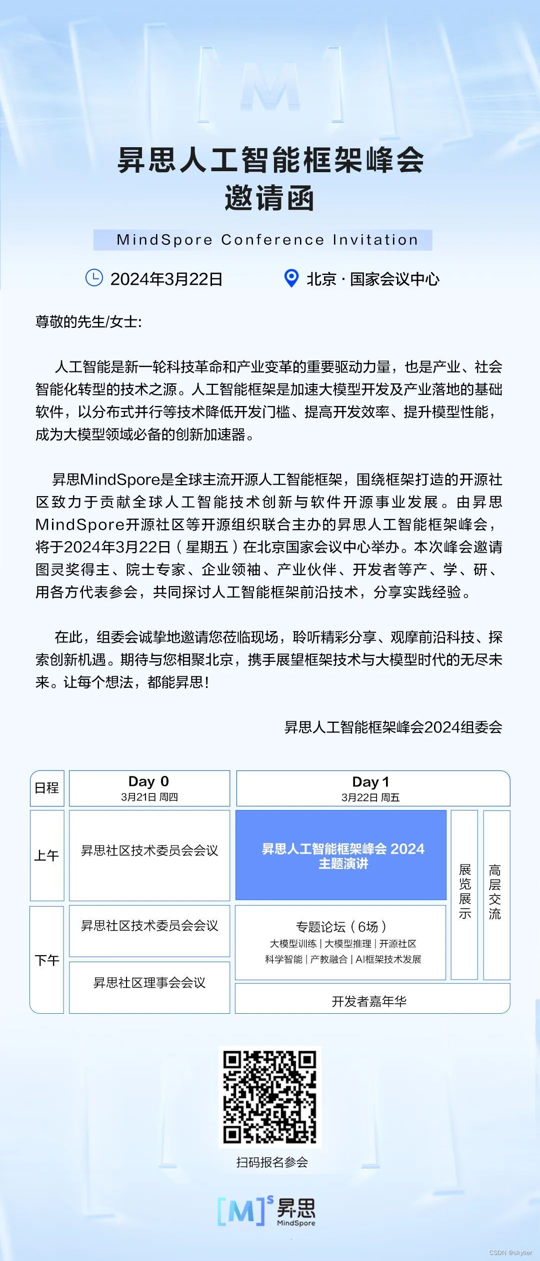 昇思MindSpore人工智能框架峰会,北京国家会议中心,2024年3月21闭门会议,3月22日主论坛和开发者嘉年华,人工智能产学研用专家齐聚,诚邀各位开发者参加~~