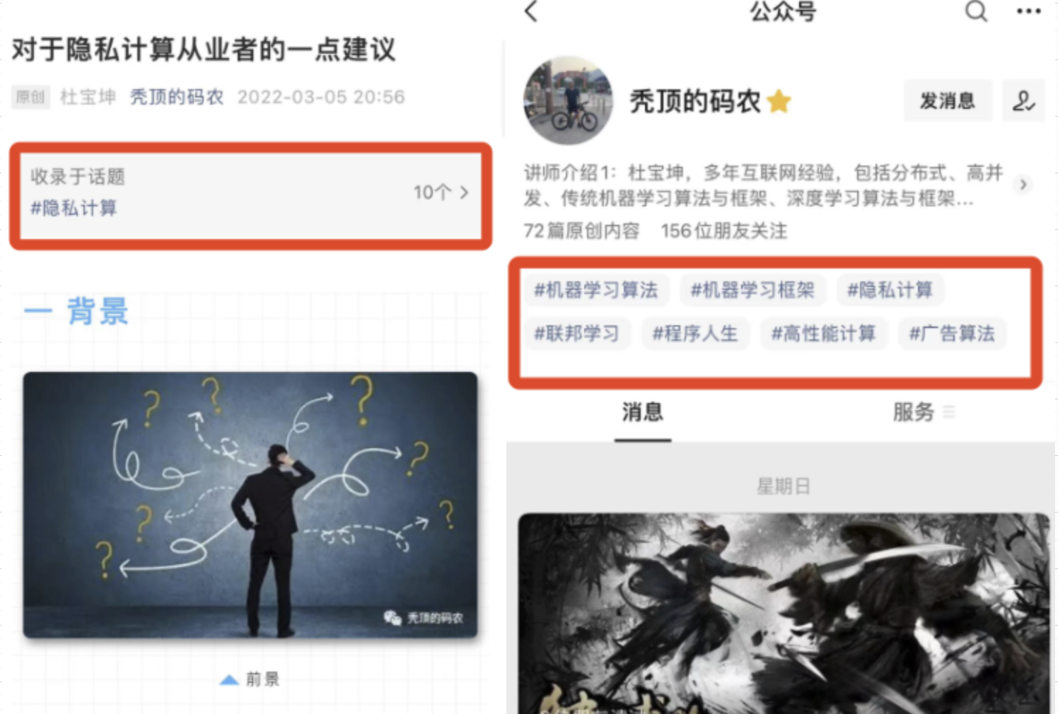 自己撰写博客已经很长一段时间了,由于个人涉猎的技术领域比较多,所以对高并发与高性能、分布式、传统机器学习算法与框架、深度学习算法与框架、密码安全、隐私计算、联邦学习、大数据等都有涉及。主导过多个大项目包括零售的联邦学习,社区做过多次分享,另外自己坚持写原创博客,多篇文章有过万的阅读。公众号秃顶的码农大家可以按照话题进行连续阅读,里面的章节我都做过按照学习路线的排序,话题就是公众号里面下面的标红的这个,大家点击去就可以看本话题下的多篇文章了,比如下图(话题分为:一、隐私计算 二、联邦学习 三、机器学习框架 四、机器学习算法 五、高性能计算 六、广告算法 七、程序人生),知乎号同理关注专利即可。