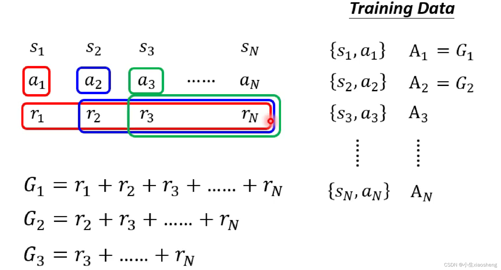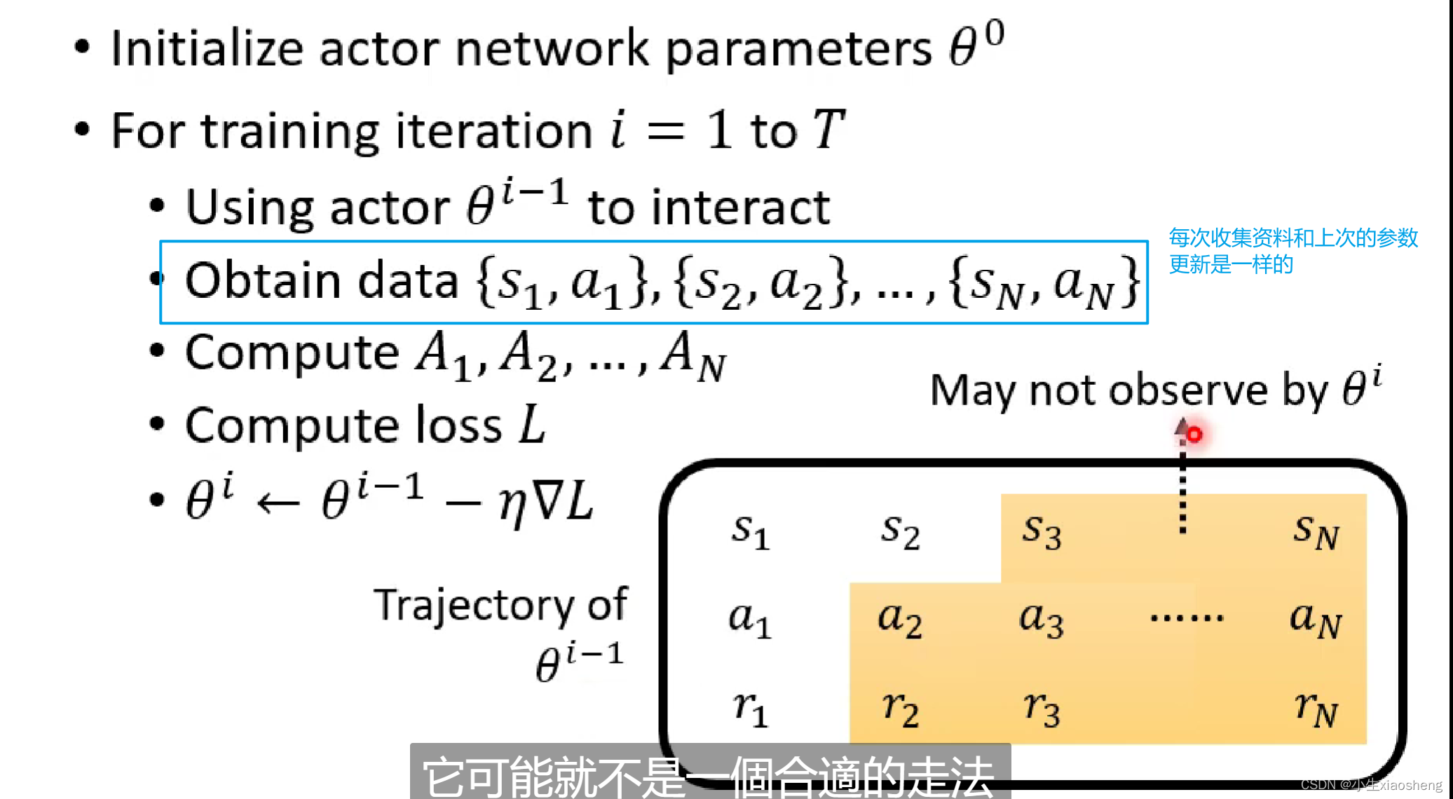 得到Ai的有以下几种情况:1.首先我们还是要去收集资料,不过得有一个Actor网络,让这个网络和环境进行互动,这样我们就能收集到训练资料中的s和a。而Actor可以理解为一个随机出来的函数,当然此时得到的结果可能就是很乱的训练资料,我们对这些训练得到的结果进行评价也就是Ai,这个评价结果就是训练时得到的reward,但是这个方法并不是一个很好的方法,因为一个行为肯定会影响接下来的行为,但是这样只考虑了目前的情况,所以不是很好,而且可能存在这样的情况我们需要牺牲部分好的reward,而得到最终整个好的reward。2.所以有这种方法,前面执行动作会造成后面所有的结果,所有就把这个动作之后的所有reward加起来,但是这个方法也存在一个问题,比如整个资料特别长,所以前面的动作有影响,但是不一定是最重要的影响。所以我此基础上对于相应得到reward乘上距离的概念。