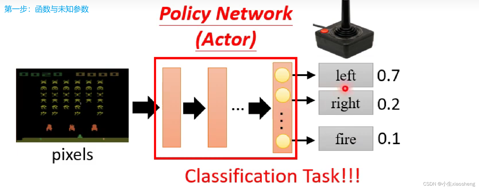 第①步:在RL中第一步里面的函数就是Actor,我们一般把这个函数叫做Policy Network,这个网络可能和分类网络很像,当然中间的网络可以是各种网络,最后的结果可以是概率最大的执行,也可以是概率大的执行的概率大一些,但是不一定执行。