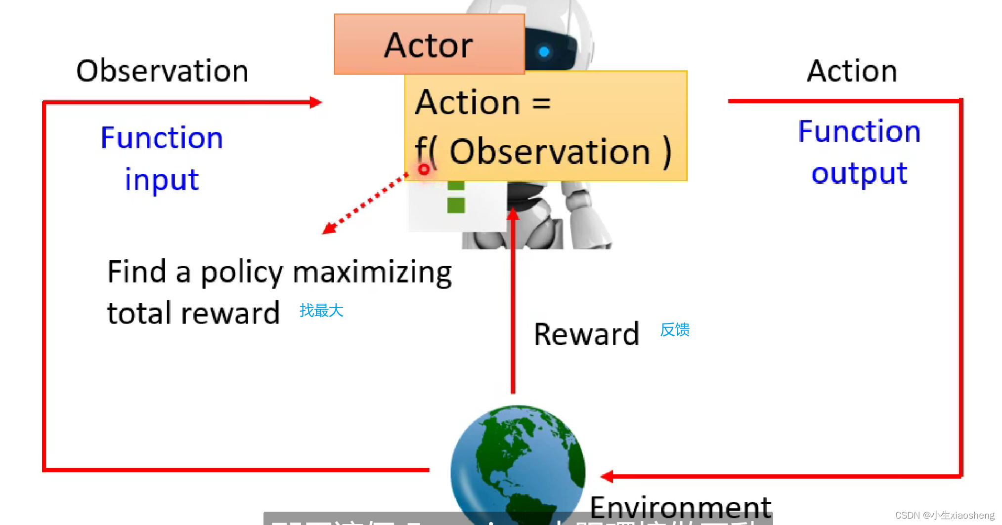 RL其实和machine Learning很像,也是三个步骤。机器学习就是找一个函数,RL也是找一个函数,这个函数里面有两个变量-行为(Actor)和环境(Environment),两者进行互动。