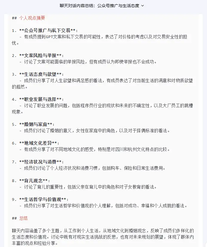 请将以下聊天对话内容的个人观点(必须有观点)进行总结,聊天者昵称用1个随机字符替代,并以MD格式输出: