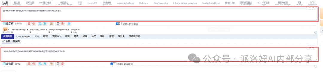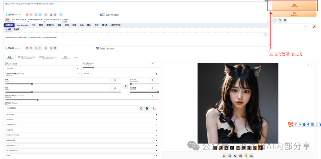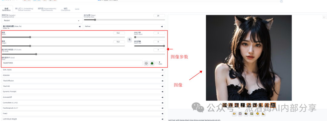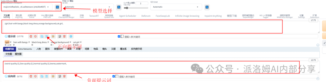 WebUI的操作流程简洁明了,共分为四步:选择模型、填写提示词、设置参数和点击生成。最终的图像效果取决于模型、提示词和参数设置三者的综合作用: