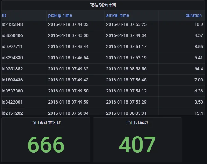 - Query 1:展示当日出行订单预估到达时间及预估行程时间