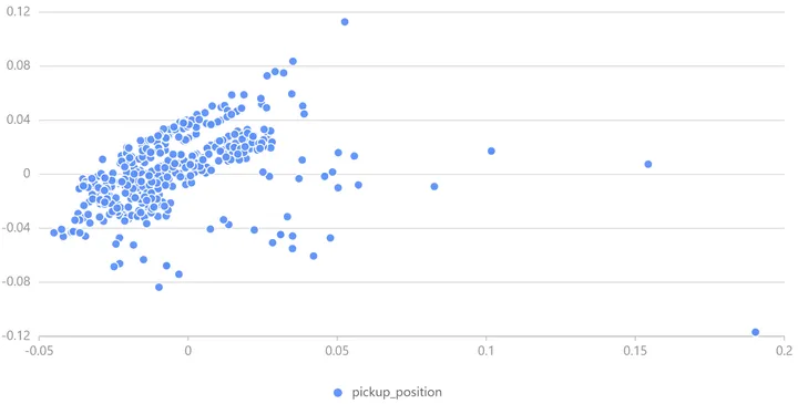 原始数据中的纬度经度信息集中在40.70 °N 至40.80 °N 及73.94 °W 至74.02 °W之间,数据间位置特征差异不够显著,使用 PCA 来转换经度和纬度坐标,有助于 XGBoost 决策树的拆分,DolphinDB PCA 函数使用详见 pca — DolphinDB 2.0 documentation。
