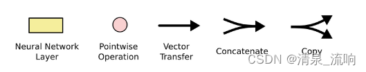 在上图中,每条线都承载着整个矢量,从一个节点的输出到另一个节点的输入。 粉色圆圈表示按点操作,如矢量加法,而黄色框表示学习的神经网络层。 合并的行表示串联,而分叉的行表示要复制的内容,并且副本到达不同的位置。