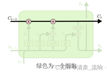 的那条横线所表示的就是细胞状态。这条线的意思就是Ct-1先乘以一个系数,再线性叠加后从右侧输出。
