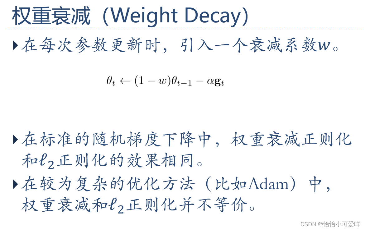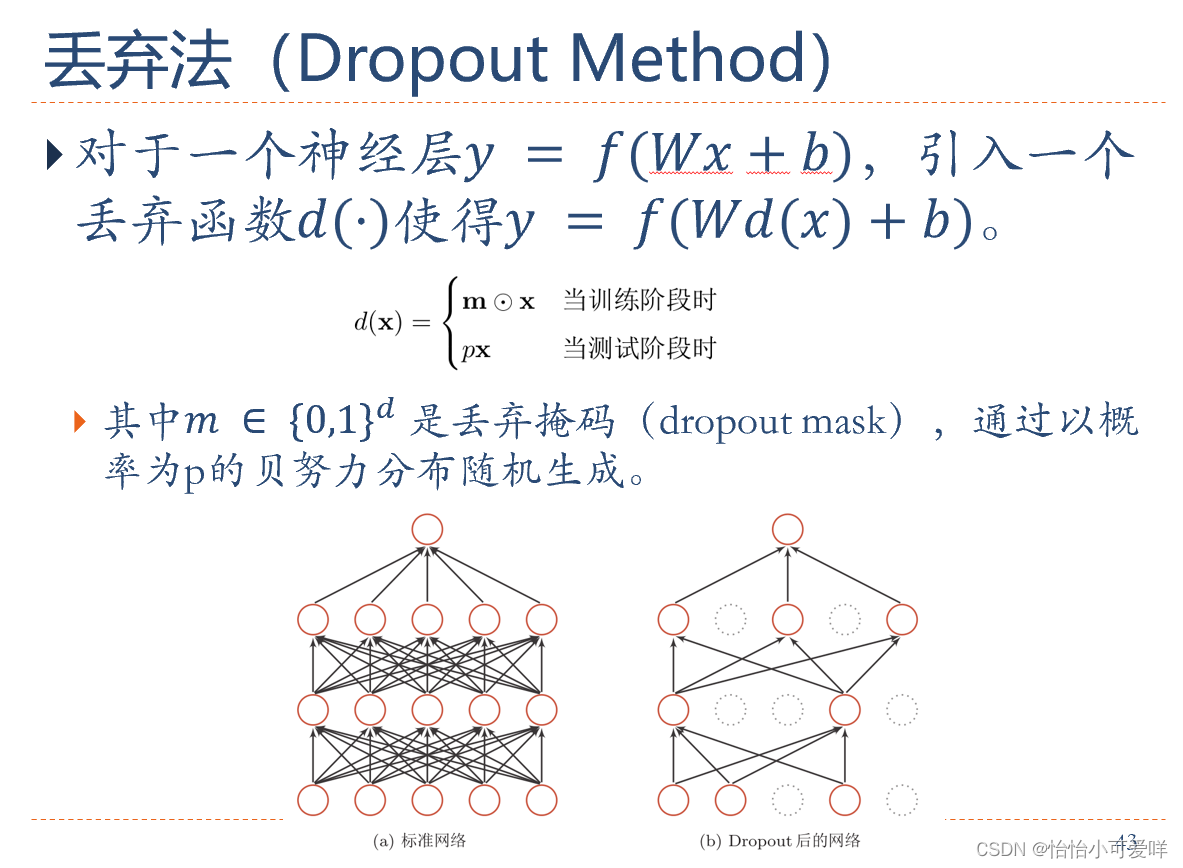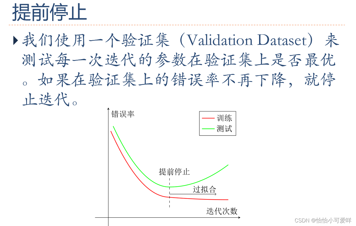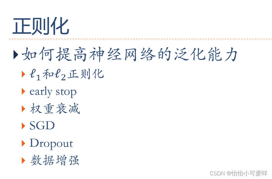7. 神经网络正则化的方法具体原理以及方法:增加约束(L1和L2增强、数据样本增加)、干扰过程(权重衰减、随机梯度下降、早停法early-stop、暂退法dropout)。