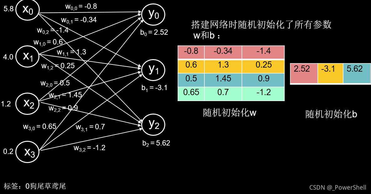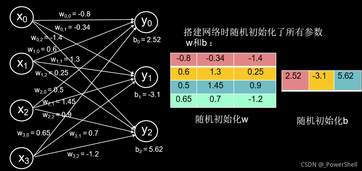 有了网络结构,线上的权重w和偏置b会被随机初始化为一些随机数,