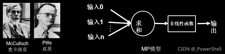 1943年,英国 物理学家麦卡洛克 和 数学家皮茨 这两个人就给出了神经元的计算模型,称之为MP模型,MP模型是每一个输入特征乘以线上的权重,求和,再通过一个非线性函数输出。