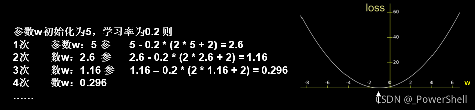 我们用这个公式体会一下反向传播参数更新的过程,假设损失函数是 W+1 的平方,损失函数对参数w的偏导是 2W+2 , 参数w在初始化的时候被随机初始化为 5 , 学习率是个超参数 我们设置为 0.2 ;