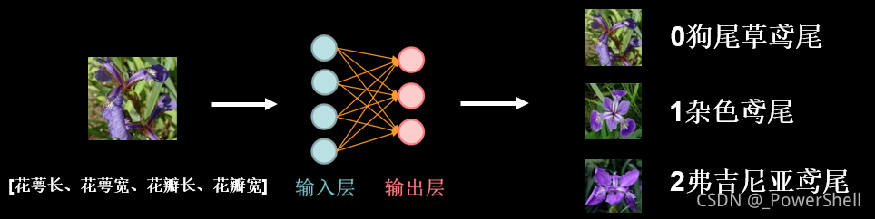 输入是四个特征,所以这里是四个输入节点,输出是三种鸢尾花各自可能性大小,所以这里是三个输出节点
