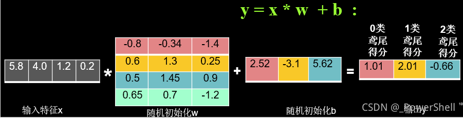 针对我们鸢尾花的例子,x是输入特征,w是权重,b是三个偏置项,y就是三种鸢尾花各自的可能性大小。