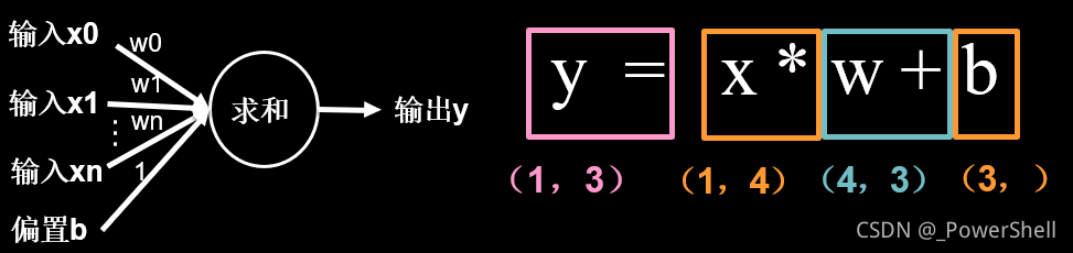 为了求解简单我们暂时去掉非线性函数,把MP模型简化为这个样子,就是所有的输入x乘以各自线上的权重w,求和,加上偏置项b,输入y。