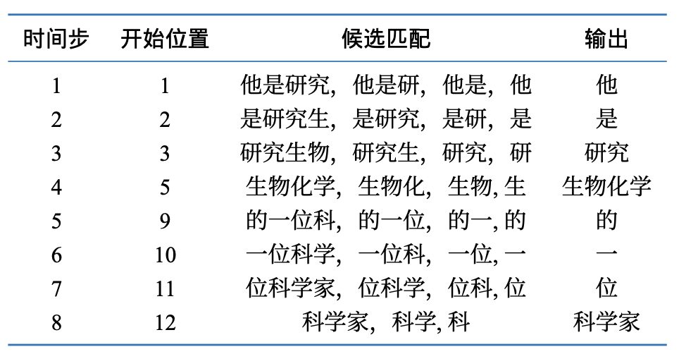 例如:针对句子 “他是研究生物化学的一位科学家”,前向最大分词的过程如表2.2所示。为简单起见,词典中词语最大长度假设为 4,词表为 {“他”,“是”, “研究”, “生物化学”, “的”, “一”, “位”, “科学家”}。如上图。我们固定住头,即『他』。我们从句子末尾开始向前找,“他是研究”有没有在词典里。有,就当成分词。不是的话前移,直到『他』;依次类推,直到完成整个句子的切分,下面将通过代码展示前向最大匹配算法流程。