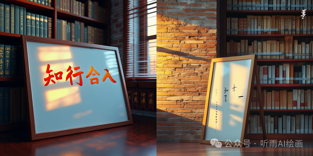 提示词:暮色时分的大学图书馆,一面胡桃木边框的玻璃白板斜靠复古砖墙,荧光笔书写的行楷‘知行合一’折射出琥珀色光晕,笔画间流淌着墨水渗入玻璃的细微纹路。背景虚化的红木书架上堆满中文古籍,窗外晚霞透过百叶窗在白板表面切割出平行的暖橘色条纹,整体画面融合新中式与低多边形风格,色调采用黛蓝/赭石/琉璃黄