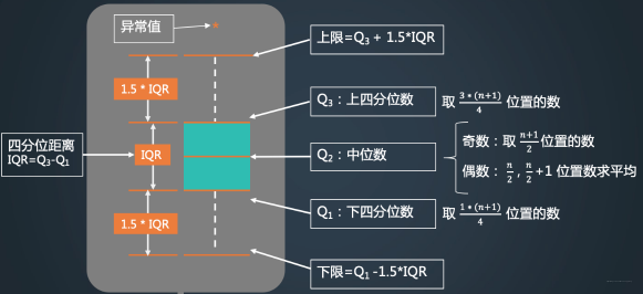对称性:若中位数位于箱子的中间位置,则数据分布较为对称。若离的距离较离的距离大,则表示数据分布向左倾斜,反之数据右倾斜,且能看出分布尾部的长短。