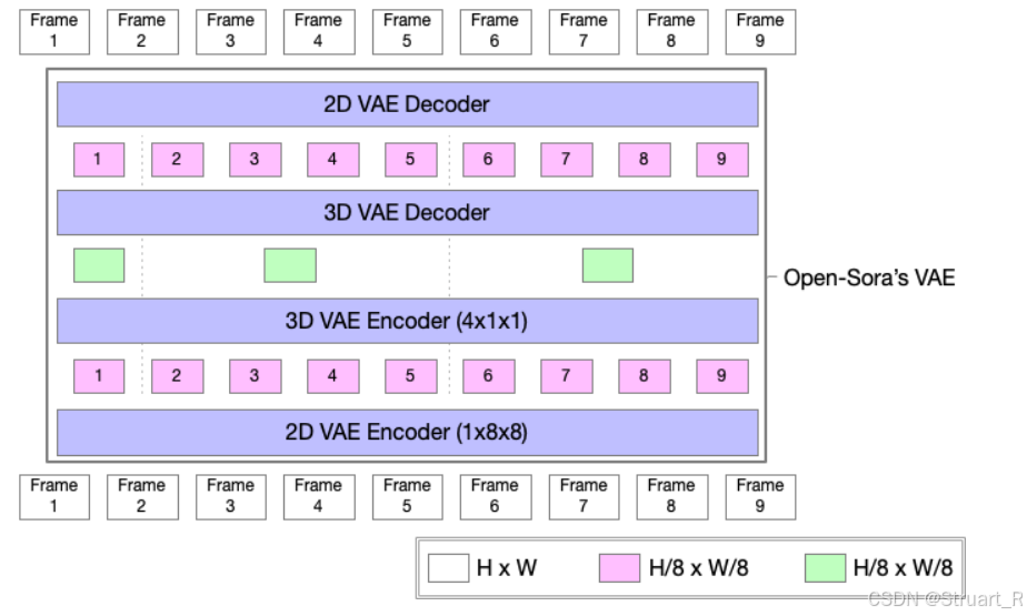 在Open-Sora 1.0和1.1中,使用了Stability-AI中的2D VAE,将视频空间维度上压缩8*8倍。为了减少时间维度,通过每三帧提取一帧进行降采样,但是由于产生FPS的减少,这种方法导致的时间流畅性较低。