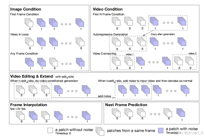 通过采用遮蔽策略,可以在输入中指定需要 Conditioning 的帧。在前向传播过程中,这些未被遮蔽的帧会被赋予 0 时间步,而其他帧保留原有的扩散时间步。