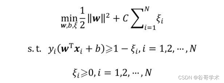 因子ξi≥0,使函数间隔加上松弛变量大于等于1。这时候原式变为