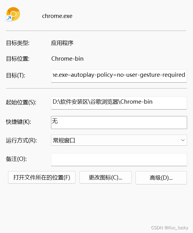 3、在目标栏后边加上–autoplay-policy=no-user-gesture-required即可解决