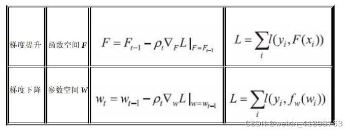 下表是梯度提升算法和梯度下降算法的对比情况。可以发现,两者都是在每 一轮迭代中,利用损失函数相对于模型的负梯度方向的信息来对当前模型进行更 新,只不过在梯度下降中,模型是以参数化形式表示,从而模型的更新等价于参 数的更新。而在梯度提升中,模型并不需要进行参数化表示,而是直接定义在函 数空间中,从而大大扩展了可以使用的模型种类。