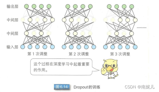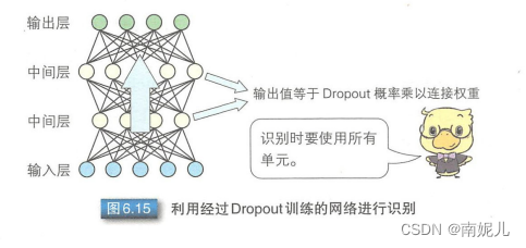 神经网络的训练过程就是对每个Mini-Batch使用误差反向传播算法不断迭代调整各个参数的值。Dropout就是在每次调整时,随机选取一部分单元将其单元的输出设置为0.计算误差时,原本是使用所有单元的输出值,但是由于有部分被丢弃,所以从结果上来看,Dropout起到了与均一化方法类似的作用。但是对舍弃单元进行误差反向传播时,仍然使用舍弃之前的值。