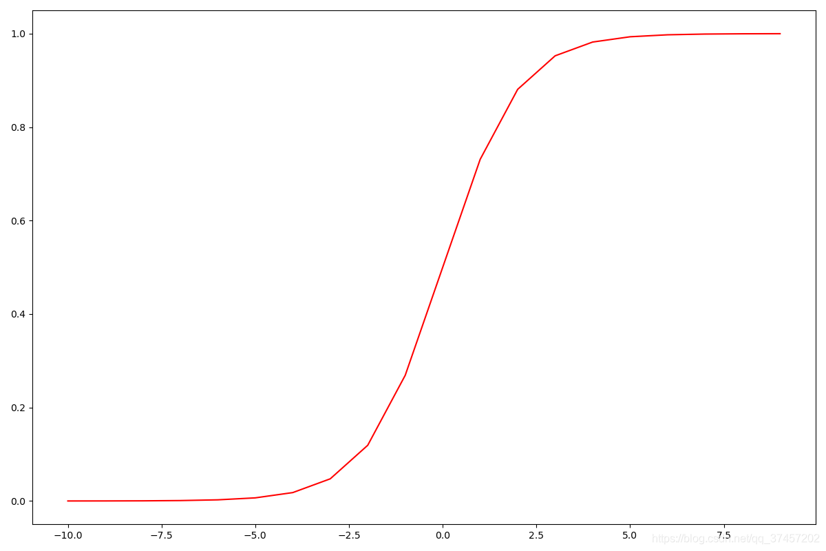 ax.plot(nums, sigmoid(nums), 'r')