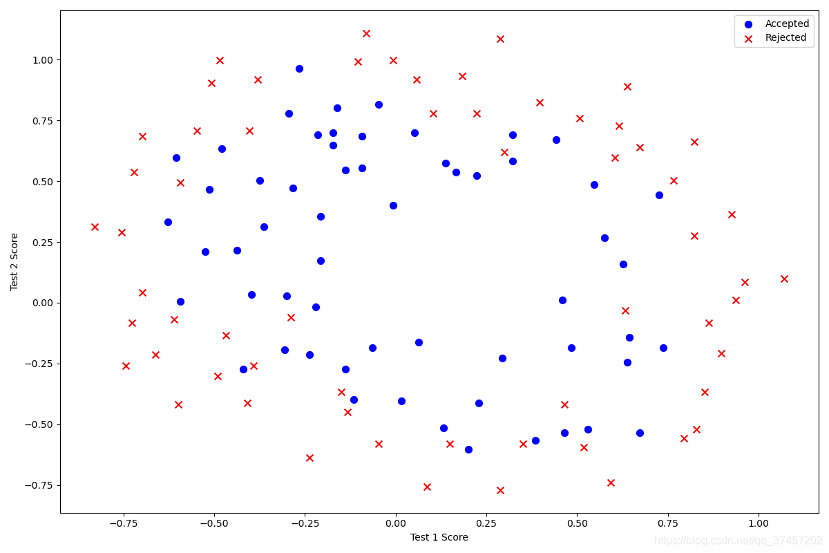 ax.scatter(negative['Test 1'], negative['Test 2'], s=50, c='r', marker='x', label='Rejected')