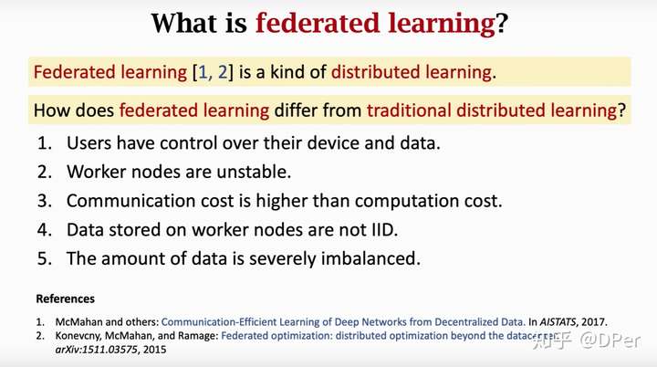 - 节点负载不平衡,有的设备数据多有的设备数据少。比如有的用户几天拍一张照片有的用户一天拍好多照片,这给建模带来了困难。如果给图片的权重一样,那么模型可能往往取决于拍图片多的用户,拍照少的用户就被忽略了。如果用户的权重相同,这样学出来的模型对拍照多的用户又不太好了。负载不平衡也给计算带来了挑战,数据少的用户可能一下子算了很多epoc了,数据多的用户还早着。这一点上,联邦学习不像传统的分布式学习可以做负载均衡,即将一个节点的数据转移到另一个节点。