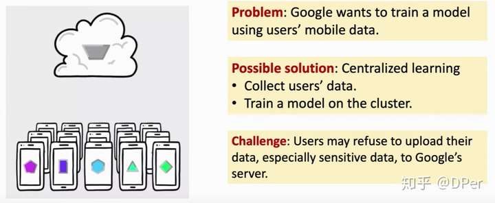 联邦学习有很实际的应用,如移动端会产生数据,但是server,比如谷歌想要从用户那里的数据进行学习。那么一种显然的解决方法就是把数据收集起来,然后学习。但是,现实生活中有着一定的限制,可能处于法律要求或者用户拒绝上传属于,没有一个中心节点可以得到所有的数据,呢么我们该如何去学习模型呢?这个就叫联邦学习。