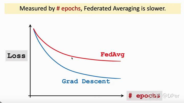 我们把Federated Averaging和梯度下降对比一下,如果以communication为横轴,那么有上图,可见用相同次数的通信,Federated Averaging收敛的更快。两次通信之间Federated Averaging让worker节点做大量计算,以牺牲计算量为代价换取更小的通信次数。如果横轴以epochs为横轴,有以下结果: